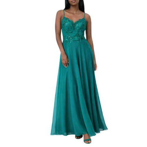 Green Satin Maxi Ball Gown with Embroidered Bodice