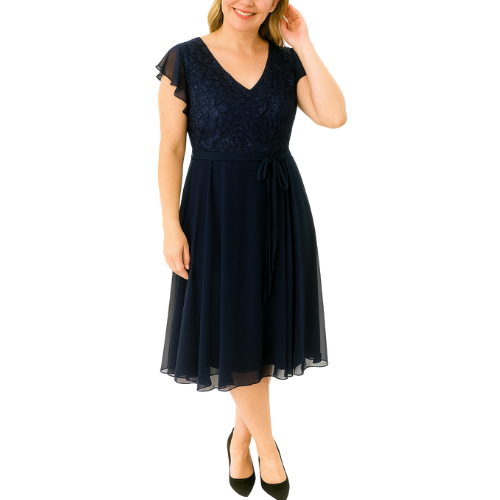 Midi Navy Blue Dress with Shinny Lace Bodice