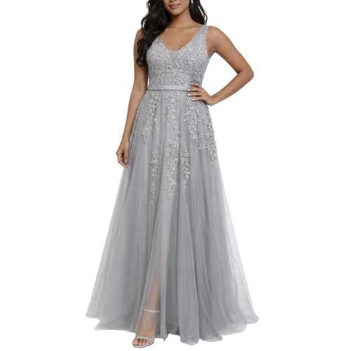 Silver Organza Ball Gown with Flower Lace and Long Train